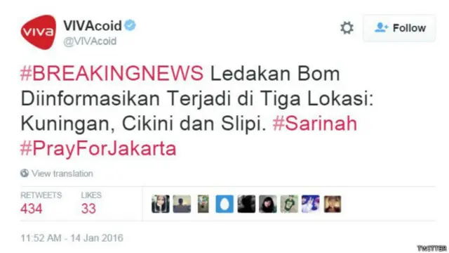 "Slipi, Kuningan dan Cikini dilaporkan ada ledakan," kata yang lain.