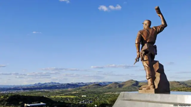 "Ini adalah patung perunggu raksasa setinggi 11 meter tentang sosok tentara tidak dikenal- tetapi mirip sekali dengan sosok Presiden pertama Namibia, Sam Nujoma," kata wartawan BBC Frauke Jensen.