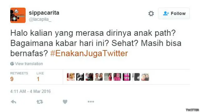 Namun dengan gangguan ini, sejumlah pengguna Twitter menggunakan kesempatan untuk menonjolkan keunggulan Twitter dibanding Path, melalui tagar #EnakanJugaTwitter.