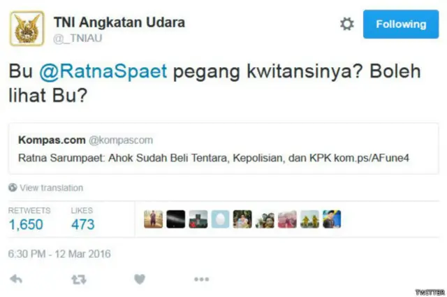 Dalam kicauannya, TNI AU mempertanyakan klaim tersebut dengan meminta 'bukti kwitansi'. "Come on.. Bu @RatnaSpaet, tuduhan seserius itu Ibu bilang "asumsi"? Come..oon!" cuitnya pada 12 Maret lalu.