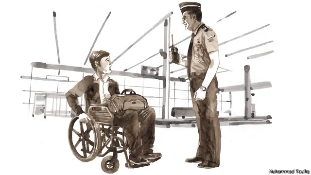 Setelah turun tangga ada masalah kedua: naik tangga ke pesawat. Itu kecil sekali ukurannya sehingga tidak mungkin bisa sendiri. Pramugari sudah pada teriak-teriak untuk minta saya dibantu. Akhirnya petugas parkir pesawat ikut bantu, mengangkat kursi roda saya.