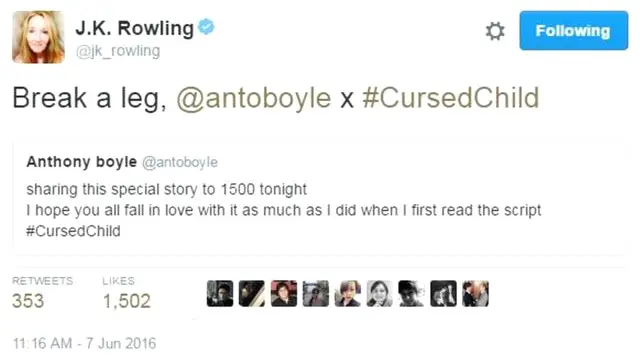 Sebelum penampilan Rowling mencuit di akun twitternya, mengirim pesan agar ‘santai’ jelang penampilan, kepada Anthony Boyle, pemeran anak Draco, Scorpius.