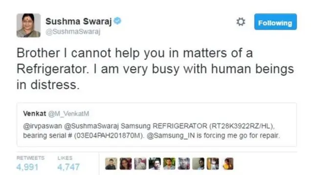 Menteri Luar Negeri India, Sushma Swaraj, menulis pesan di Twitter bahwa dia bukan orang yang tepat untuk dihubungi jika menghadapi masalah peralatan rumah tangga.
