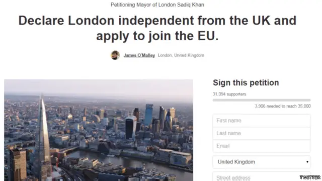 Sebuah petisi online yang dimulai oleh jurnalis James O'Malley, pendukung dari kampanye Remain (bergabung dengan Uni Eropa), meraih lebih dari 30.000 tanda tangan pada Jumat lalu. Petisi ini berjudul, "Deklarasikan London merdeka dari Inggris dan daftar menjadi anggota Uni Eropa."