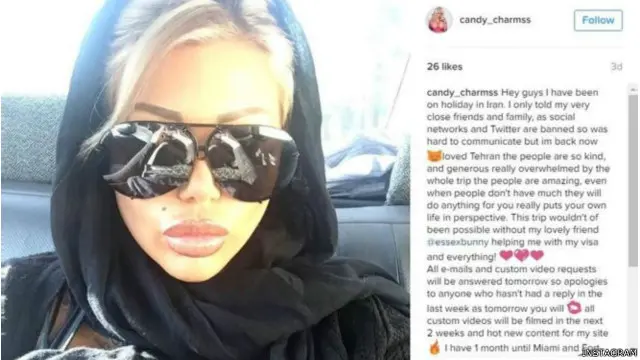 Kunjungan Candy Charms diketahui luas justru saat dia sudah pulang dari Iran, dan menggunggah foto di atas dalam akun Instagramnya. Foto ini menunjukan dirinya menggunakan kerudung hitam - menuruti aturan konservatif negara itu terkait pakaian perempuan.