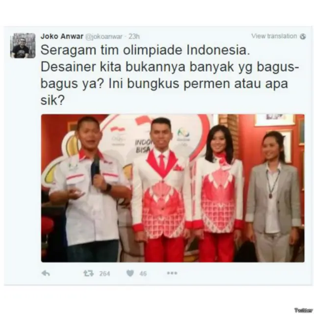 Barisan atlet Indonesia yang turut dalam parade pembukaan Olimpiade 2016 di Stadion Maracana, Rio de Janeiro, pada Jumat (05/08) malam waktu setempat, menimbulkan beragam reaksi di media sosial. Seragam yang mereka kenakan menjadi pemicunya.