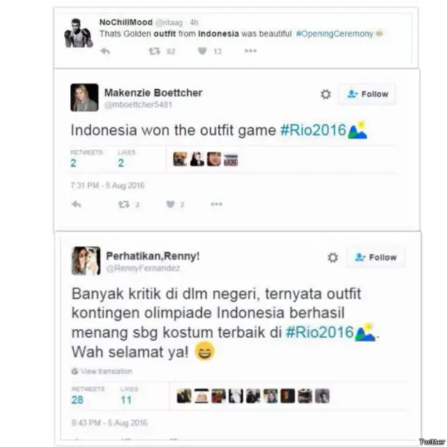 Ahmed al Omran, koresponden harian Wall Street Journal, menyebut kontingen Indonesia pantas memenangkan kategori pakaian paling mengesankan dalam pembukaan Olimpiade 2016. Cuitan Al Omran di Twitter kemudian dicuitkan kembali sebanyak 976 kali.