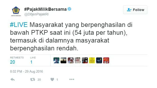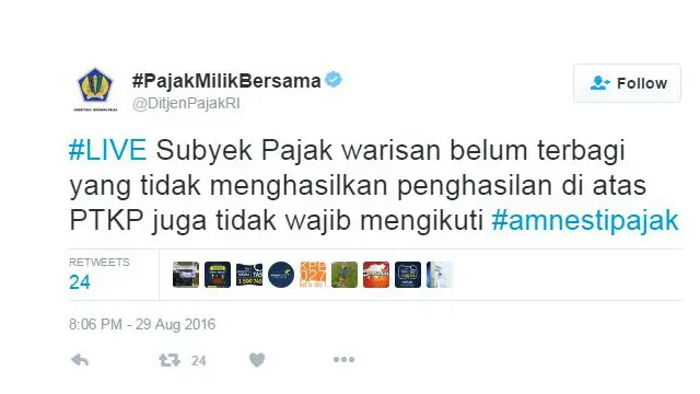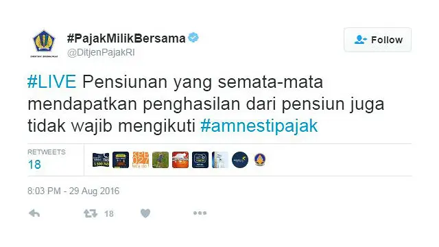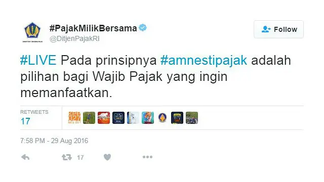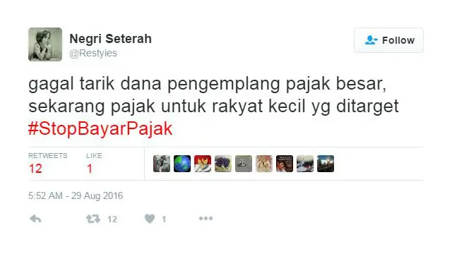 Akun anonim @Restyies yang memiliki tidak kurang 13 ribu pengikut berkicau bahwa amnesti pajak yang semula ditujukan untuk membawa pulang dana milik wajib pajak dan pengemplang pajak Indonesia yang disimpan di luar negeri, ‘mulai menarget rakyat kecil’.