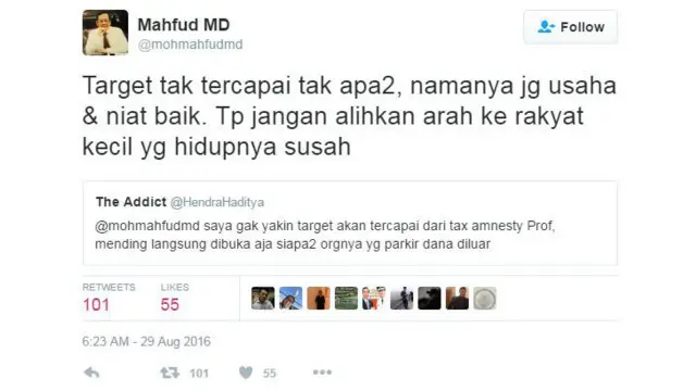 Hal senada disampaikan Mantan Ketua Mahkamah Konstitusi, Mahfud MD, lewat akunnya, @mohmahfudmd. Pemerintah disebutnya mulai menyasar penerimaan pajak dari masyarakat menengah ke bawah karena “... target tidak tercapai...”.