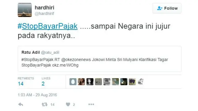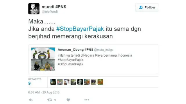Akun @niaeffendi menyebut “#StopBayarPajak itu sama dengan berjihad memerangi kerakusan”. Sementara akun @hardhirif mencuit “#StopBayarPajak... sampai Negara ini jujur pada rakyatnya..”
