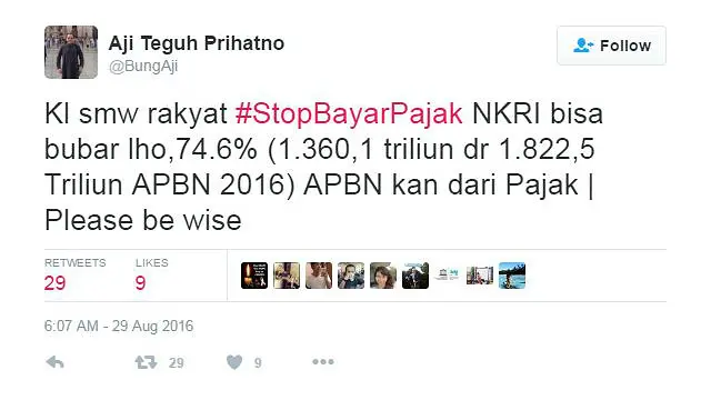 Sementara Aji Teguh Prihatno lewat akun Twitter @BungAji berujar bahwa berhenti membayar pajak akan membuat ‘negara tidak bisa berjalan’. Dia menyatakan “74,6% APBN kan dari Pajak. Please be wise”.