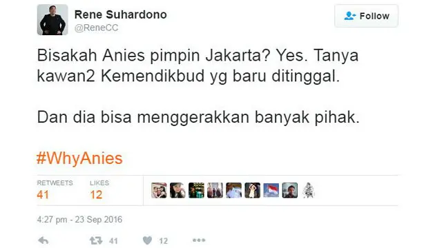 Sebut saja penulis dan motivator Rene Suhardono lewat akun Twitternya @ReneCC, yang memperlihatkan sokongan kepada pasangan Anies Baswedan-Sandiaga Uno. Akun dengan lebih 150.000 pengikut itu mencuit bahwa Anies mampu memimpin Jakarta, “dan dia bisa menggerakkan banyak pihak.”
