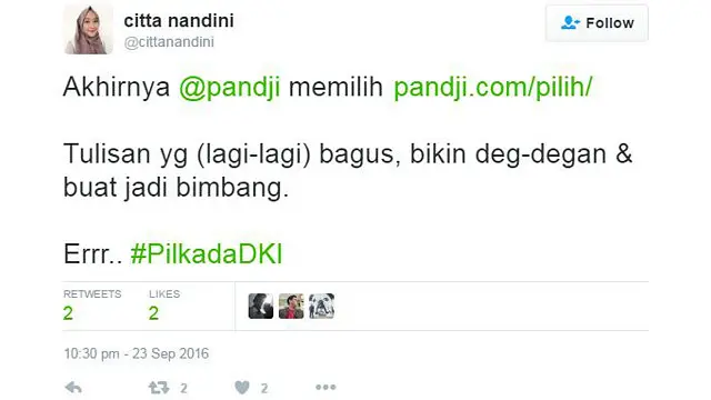 Namun, dukungan paling masif terhadap Anies, tampak dari cuit-cuitan penyiar dan komedian terkenal Pandji Pragiwaksono, yang akun Twitternya, @pandji, memiliki lebih 897.000 followers.