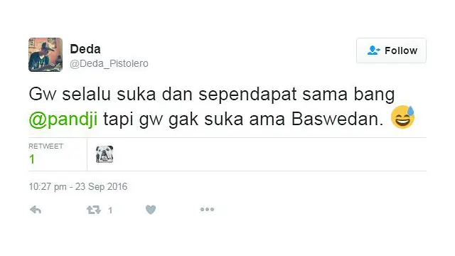 Sementara akun @Deda_Pistolero menyatakan meskipun senang dengan pernyataan-pernyataan si penulis, dia tetap “tidak suka” Anies Baswedan.