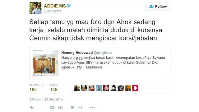 Sementara itu, komposer musik Addie MS ikut memperlihatkan dukungan kepada pasangan Ahok-Djarot. Terbukti, cuitannya tentang simpatinya terhadap Ahok, di akunnya @addiems yang punya lebih satu juta pengikut, telah di-retweet lebih 100 kali.