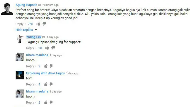 Yang bernada positif misalnya Agung Hapsah, yang lewat akun Youtube-nya menyebut netizen harusnya bisa memisahkan antara selebritas dan hasil kreasinya. “Lagunya bagus aja kok, cuma karena orang yang gak suka sama orangnya (Awkarin) yang buat jadi banyak dislike.”