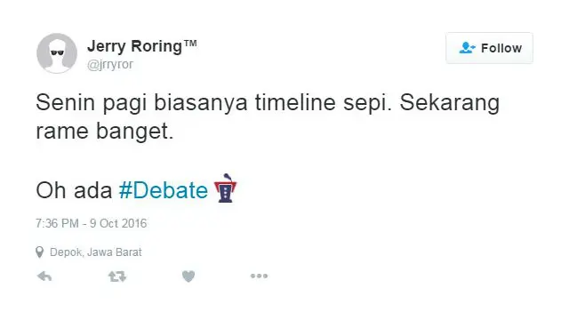 Banyaknya komentar pada Senin (10/10) pagi tersebut dirasakan oleh pengguna Twitter Jerry Roring. Lewat akun Twitter-nya, @jrryror, dia berujar, “Senin pagi biasanya timeline sepi. Sekarang ramai banget. Oh, ada #Debate.”
