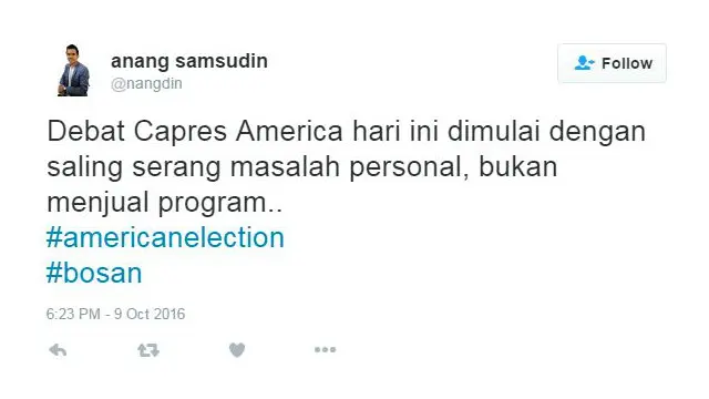 Netizen dengan akun @nangdin mencuit “#bosan”, “Debat capres Amerika hari ini dimulai dengan saling serang masalah personal, bukan menjual program.”
