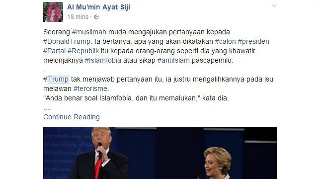 Dia menceritakan ulang bagaimana dalam debat, seorang Muslimah mempertanyakan kepada Trump, apa yang akan Trump katakan kepada Muslimah sepertinya, “yang khawatir melonjaknya Islamofobia atau sikap anti-Islam Pascapemilu.”