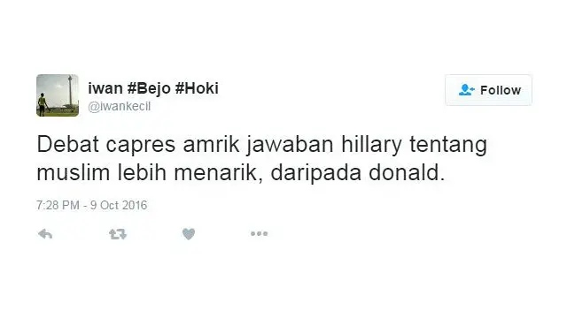 Jawaban Hillary itu mendapat komentar di Twitter oleh Iwan, lewat akun @iwankecil. “Debat capres Amrik, jawaban Hillary tentang Muslim lebih menarik daripada Donald”.