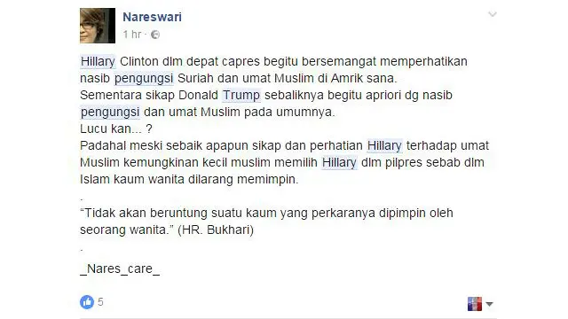Sementara di Facebook, Nareswari menyebut meskipun Hillary dinilainya ‘lebih perhatian kepada Muslim di Amerika dibandingkan Donald Trump’, tetapi “kemungkinan kecil Muslim memilih Hillary dalam pilpres sebab dalam Islam kaum perempuan dilarang memimpin.”