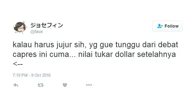 Walau materi debat cukup banyak dibicarakan di dunia maya, tidak sedikit pula yang hanya ‘sekedar meramaikan’ komentar di medsos terkait debat. Misalnya akun Twitter @faux. “Kalau jujur sih, yang gue tunggu dari debat capres ini cuma... nilai tukar dollar setelahnya.”