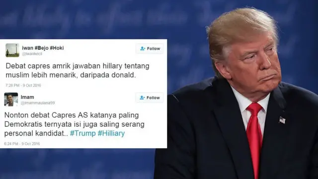 Netizen Indonesia pun ternyata ramai membicarakannya. Terutama terkait isu komentar cabul Donald Trump dan pendapat kedua kandidat terkait Islam dan pengungsi dari negara-negara Timur Tengah.