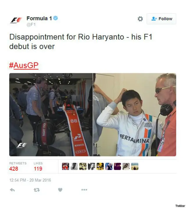 'Seri pertama F1 benar-benar penuh drama yang menegangkan. Seri selanjutnya di Bahrain pada 3 April nanti. Semoga Rio & mobilnya bebas kendala teknis', tulis akun @pertaminaracing.
