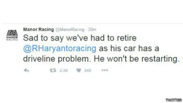 Tim Manor Racing, melalui Twitter, menyatakan kendaraan Rio bermasalah pada driveline.