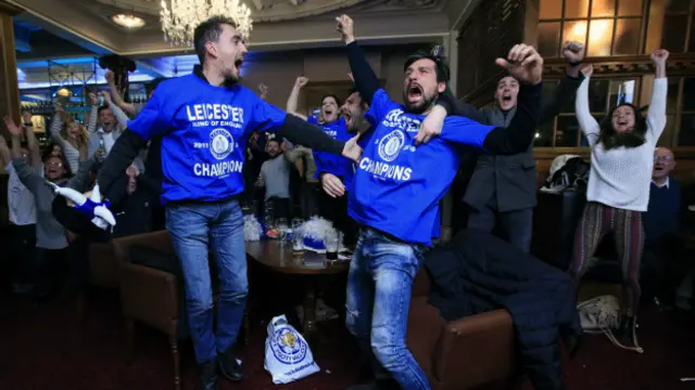 Dari pantauan wartawan BBC di Leicester, Dave Wade, ratusan orang ke luar dari sejumlah pub menuju pusat kota. Di sana, mereka menabuh drum, membunyikan klakson mobil, dan berteriak sepanjang malam. Yel-yel “champ-i-ooons" bisa terdengar dari berbagai penjuru.