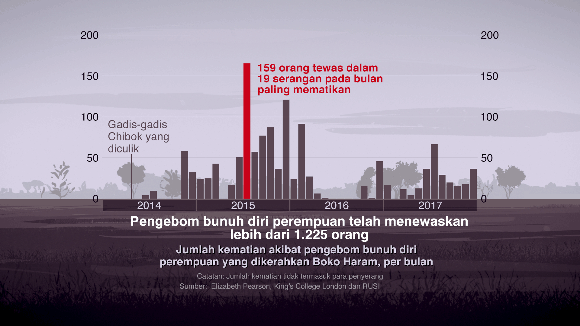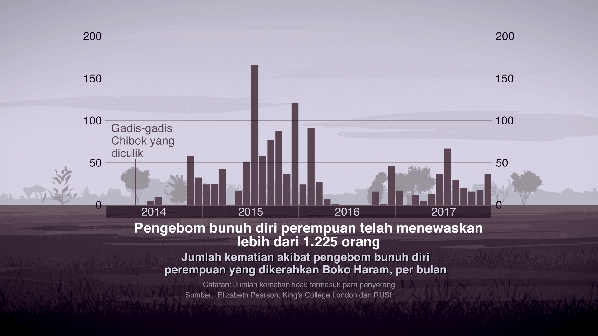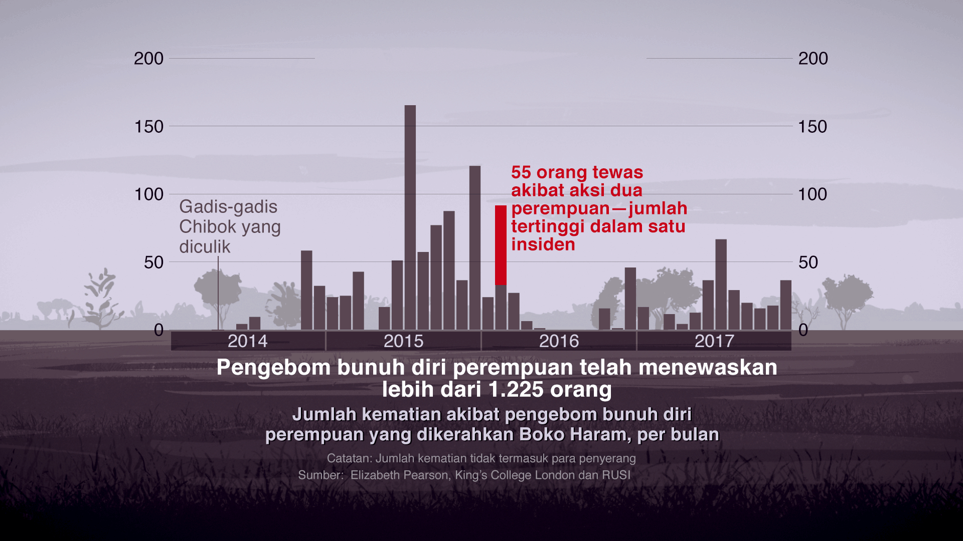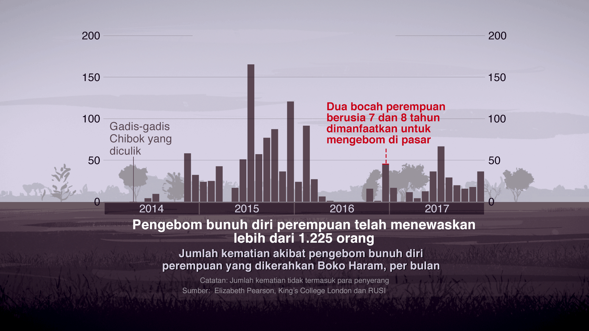 Hingga akhir 2017, sebanyak 454 perempuan dan gadis remaja telah dikerahkan dalam 232 peristiwa. Secara keseluruhan, serangan-serangan itu menewaskan 1.255 orang.
