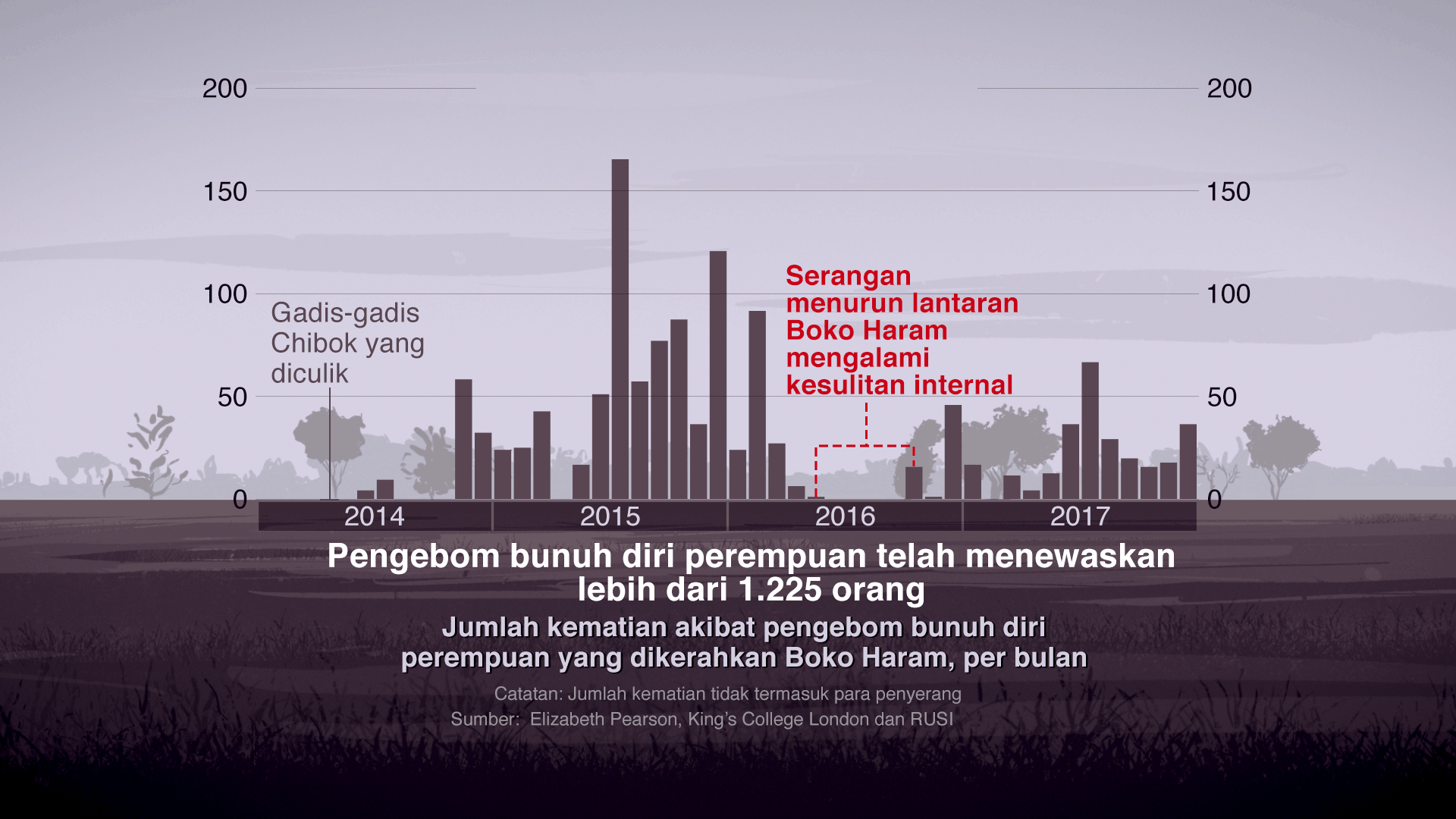 "Namun ketika serangan militer (Nigeria) semakin gencar, jumlah pemuda relawan merosot signifikan. Sehingga Boko Haram mulai menculik dan memaksa gadis-gadis untuk misi bunuh diri."