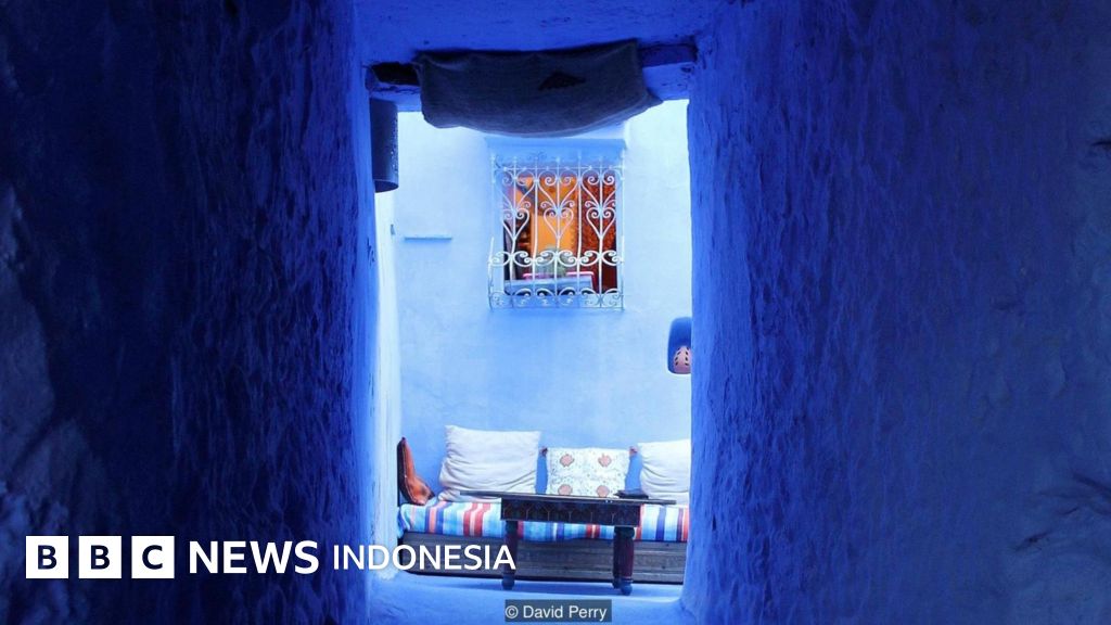 Keterangan gambar, Berada di pegunungan Rif di Maroko bagian utara, dulunya desa Chefchaouen -sebuah desa abad pertengahan- adalah sebuah desa perlintasan saja, bukan tempat singgah. Tapi, para wanita desa ini memiliki sebuah ide cemerlang untuk membuatnya populer: mengecatnya dengan warna biru.