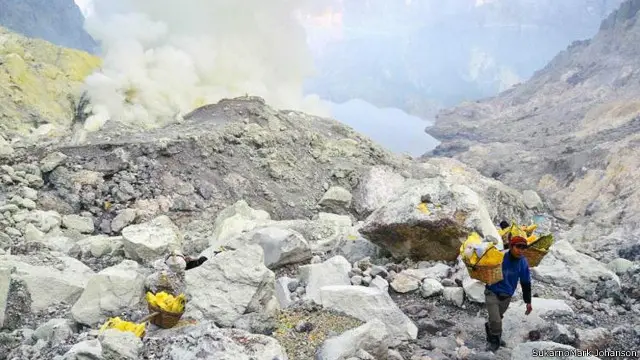 Setiap hari sekitar 300 orang pria bergerak di sepanjang bibir kawah Ijen, bergerak menuruni jalan yang berbahaya menuju jurang yang tertutup uap, memecahkan belerang dalam bongkahan besar untuk keranjang junjungnya, dan kemudian mengirimkan mineral kuning yang bau itu kembali ke atas secara vertikal, menjauh dari air kawah berwarna hijau susu menuju stasiun pembayaran sejauh tiga km.