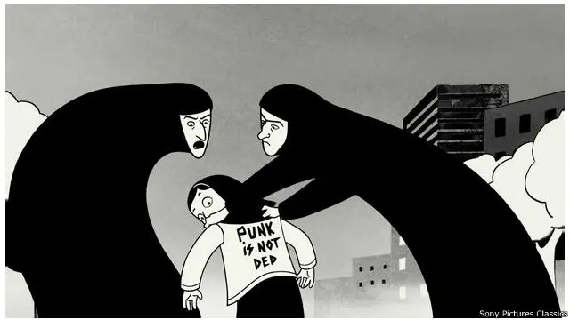 Persepolis menciptakan kembali gaya visual Satrapi yang datar, anggun dan monokromatis, tetapi sifat tokohnya sama sekali tidak hitam putih.