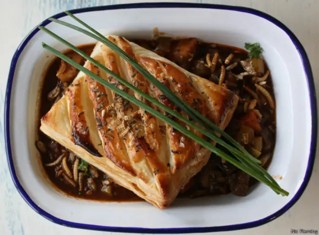 Makanan selanjutnya: pai puff pastry dengan sayur, belatung, dan jangkrik dalam saus wine. Walau saya menganggap diri sebagai petualang ihwal makanan, saya secara naluriah merasa tak nyaman melihat belatung – yang tampak seperti ulat, tetapi tiga kali lebih panjang – mengambang di permukaan saus.