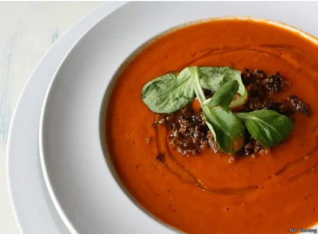 Makanan pembuka saya adalah paprika merah bakar dan sup tomat dengan remah belalang bumbu bawang putih. Sepasang mata yang mengintip di balik daun basil itu membuat perasaan tak nyaman.