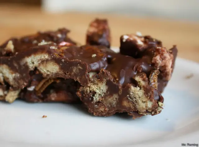 Makanan penutup yang disajikan Ellis di depan saya adalah cokelat rocky road dengan enam kaki. Tapi rasa belalang dan belatung kalah dengan manisnya cokelat dan marshmallow.
