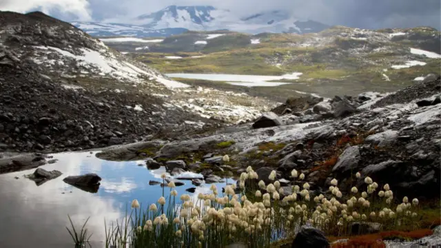 Meski Taman Nasional Jotunheimen terletak di sebelah selatan Lingkaran Arktik, ketinggiannya cukup menunjang iklim serta flora dan fauna khas Arktik. Masa musim panas di sepanjang Juli sampai pertengahan Agustus cenderung pendek dan musim dingin panjang dan sulit. Pada foto di atas tampak tumbuhan Arktik yang menambah warna pada pemandangan pegunungan terjal. (Foto: Stuart Butler)