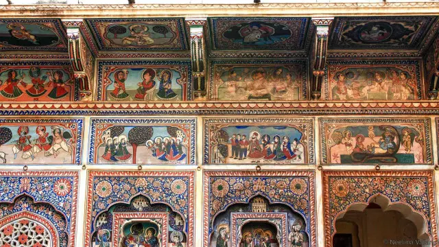 Lukisan dinding menghiasi semua permukaan Terinspirasi oleh lukisan dinding yang diperkenalkan oleh Raja Rajput di Jaipur pada abad 17 di Amer Fort, para pedagang membuat lukisan di setiap inci dari dinding haveli – termasuk eksterior, interior, langit-langit dan bahkan celah di bahwa lengkungan dan atap. Hiasan dari epik kuno Hindu Mahabharata dan Ramayana – bersama dengan hiasan dengan desain dan pola bunga – yang merupakan motif yang paling banyak ditemukan pada lukisan dinding buatan abad 19. (Kredit: Neelima Vallangi)