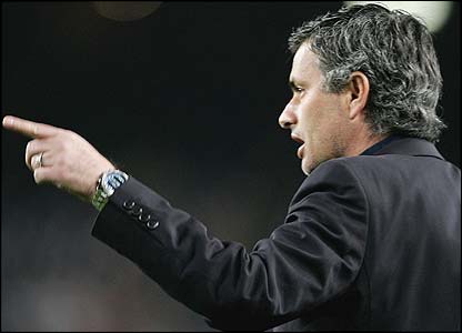 Bos Chelsea Jose Mourinho memberikan arahan di saat klubnya berusaha menembus pertahanan tim tuan rumah Barcelona.