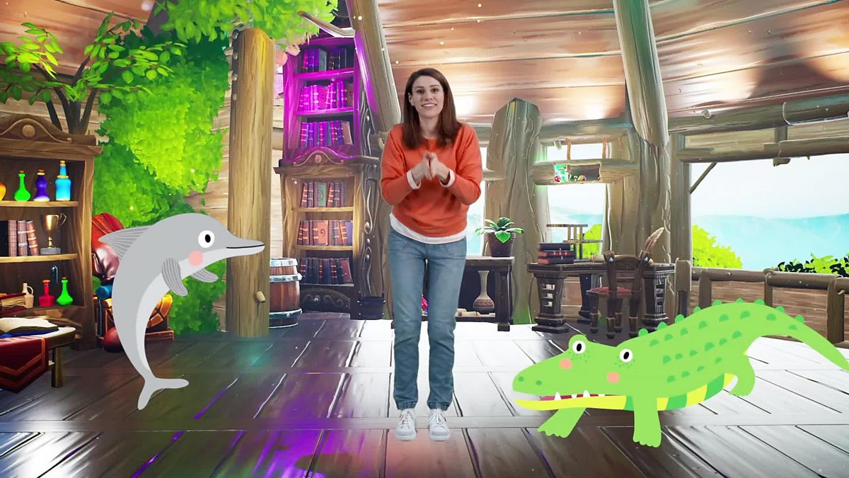 Tha Sophie agus a caraidean a’ bocadaich coltach ri crogall agus leumadair. Sophie and her friends dance like a crocodile and a dolphin.