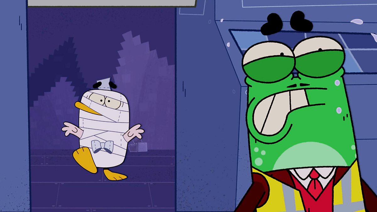 Frog creates chaos in a loo roll factory, leaving Duck covered in toilet paper. Duck just wants to fix the machine, but Frog is convinced he’s a spooky mummy!