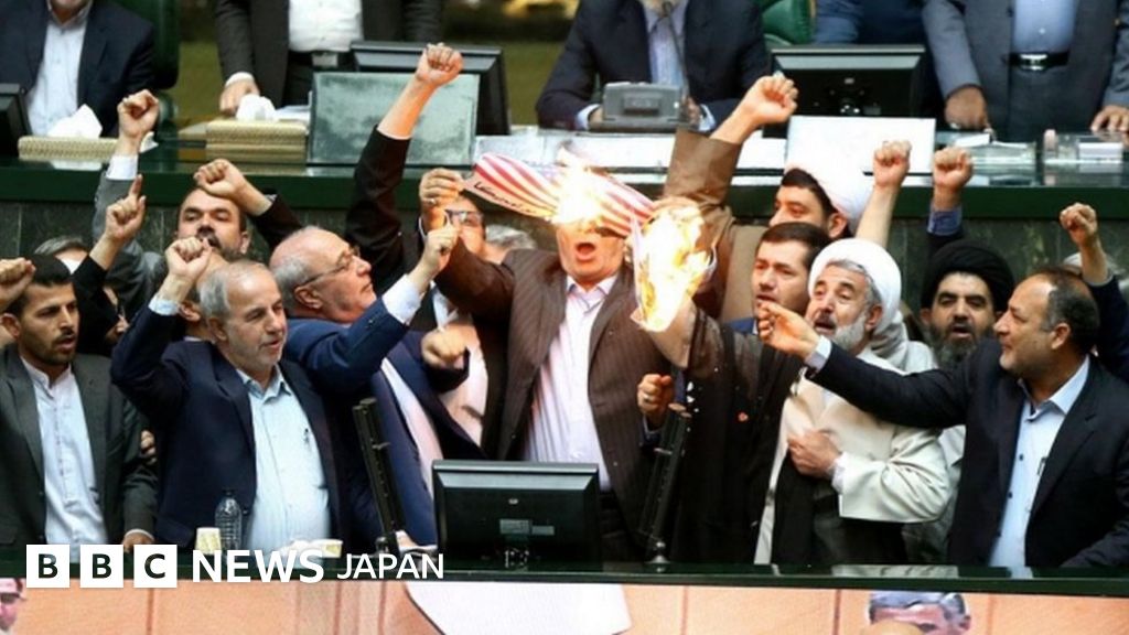 画像説明, 米国の核合意離脱に反発し星条旗を燃やすイラン国会議員たち(9日、テヘラン)
