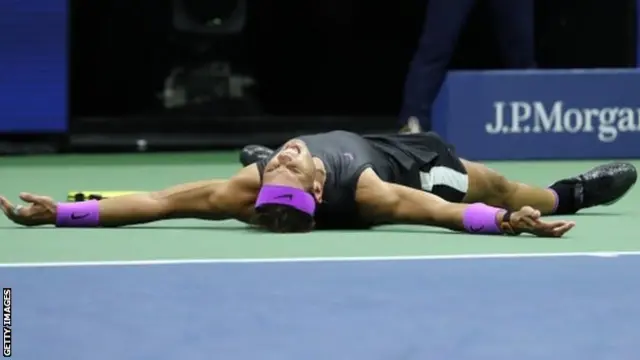 最終セット第10ゲーム、ナダルは3回目のマッチポイントをものにして勝利を決めると、コートの上に崩れるようにして仰向けになり、顔を覆った。