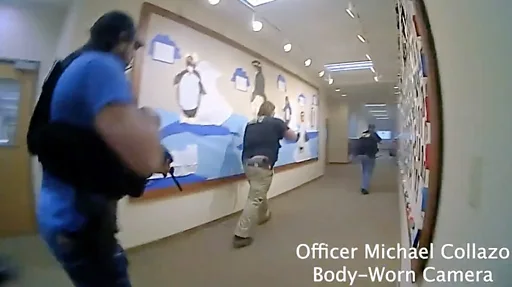 ナッシュヴィル警察が公開した映像では、容疑者は正面ドアのガラスに発砲して破壊。校内に入って誰もいない廊下を歩いていた。