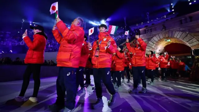 式典はイタリア古典オペラへのオマージュで幕を開けた。「アイーダ」の大型舞台セットを通って、参加92カ国の旗手が入場。イタリア映画に関係する音楽が流れた。
