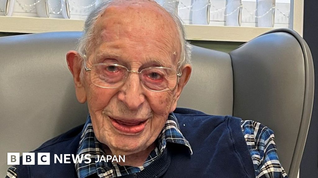 画像説明, ジョン・アルフレッド・ティニスウッドさんは4月に世界最高齢男性と認定された。画像は英西部サウスポートの介護施設でのティニスウッドさん