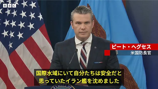 ヘグセス長官は、イランの軍艦が「国際水域では安全だと思っていた」ようだと説明。「だが魚雷によって撃沈された」と述べた。軍艦名は明らかにしなかった。