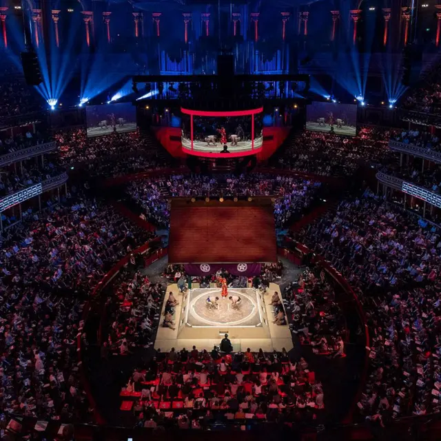 相撲の最も古い記録は、紀元前23年のものだとされる。その競技を迎えて、イギリスのヴィクトリア朝時代に建てられたロンドンのコンサートホールは完全に姿を変えた。土俵の上には重さ6トンにもなる、日本の神社様式の屋根がつるされた。